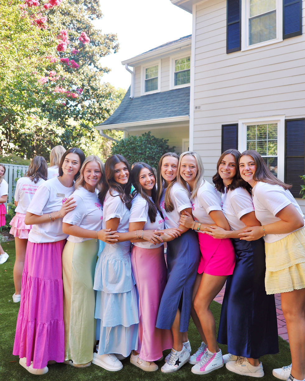 Our home is the historic 1925 Brockwell House on Henderson Street, a Chapel Hill landmark located close to Franklin Street and campus. Complete with a study room, lounge, gallery, large backyard, generous bedrooms and more, its beauty reflects our chapter’s commitment to achieving our personal best. We house 41 members each year, mostly composed of the sophomore pledge class and our lovely House Director.